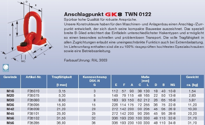 The German occupational health insurance-approved quality Grade 80 and Superior XL (Grade 100) lifting points have the following features: