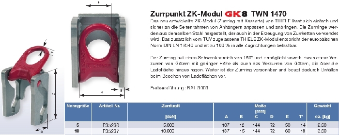 ZK modules are exclusively intended for attachment by means of welding to road truck bodywork and they are designed to secure lashing means. Lashing forces must exclusively be applied in the upper area of the lashing eyelet using commercially available mountable lashing means and their relevant accessories. ZK modules must only be used