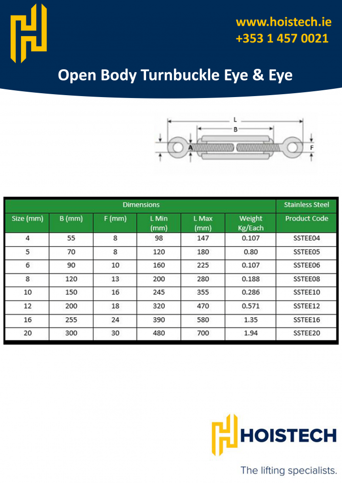 Hoistech has a complete range of wire rope tensioners and turn buckles otherwise known as rigging screws and bottle screws. Our turnbuckles or tensioners are available in several finishes and styles such as closed body turnbuckle, open body turnbuckle, stainless steel turnbuckle, galvanised turnbuckle, zinc plated turnbuckle, hook and hook turnbuckle, hook and eye turnbuckle, eye and eye turnbuckle, eye and jaw turnbuckle and jaw and jaw turnbuckle.