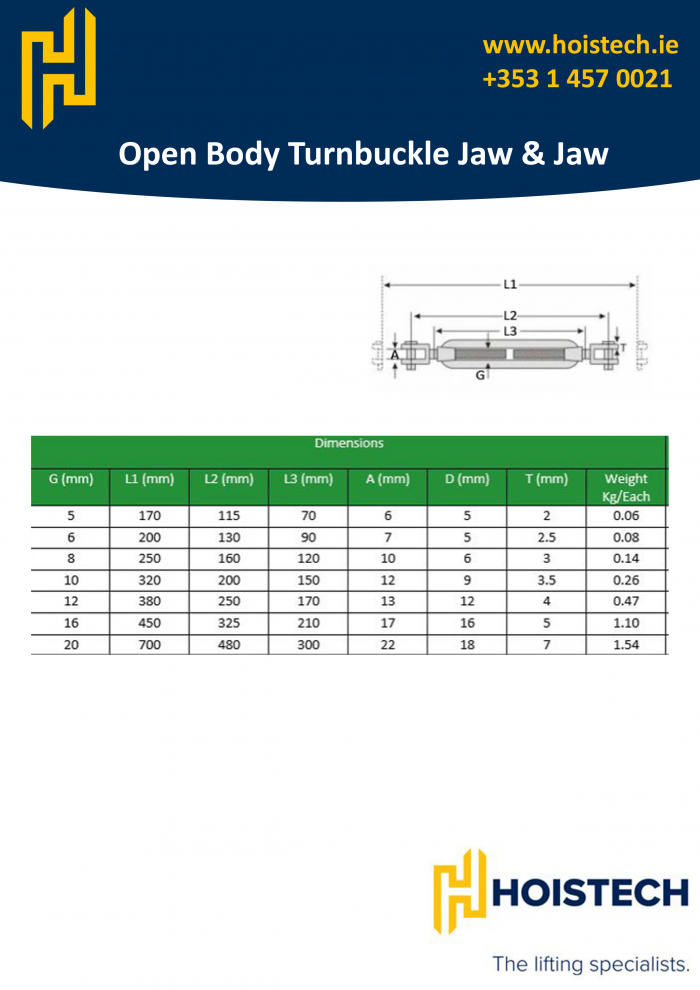Hoistech have a complete range of wire rope tensioners and turnbuckles otherwise known as rigging screws and bottle screws. Our turnbuckles or tensioners are available in several finishes and styles such as closed body turnbuckle, open body turnbuckle, stainless steel turnbuckle, galvanised turnbuckle, zinc plated turnbuckle, hook and hook turnbuckle, hook and eye turnbuckle, eye and eye turnbuckle, eye and jaw turnbuckle and jaw and jaw turnbuckle.